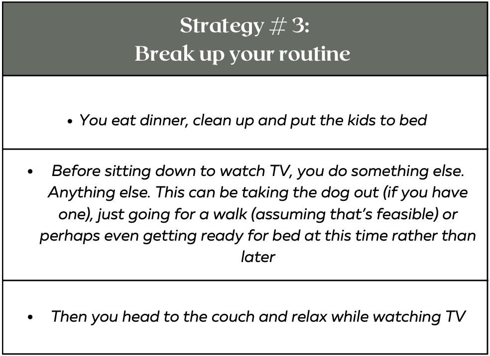 I’ve seen this work before and it can be surprisingly helpful. Imagine your evening routine in a larger sense. You may feel a bit automated from dinner on if it’s the same series of events, over and over again. With that final event frustratingly resulting in you snacking mindlessly on the couch while watching TV.